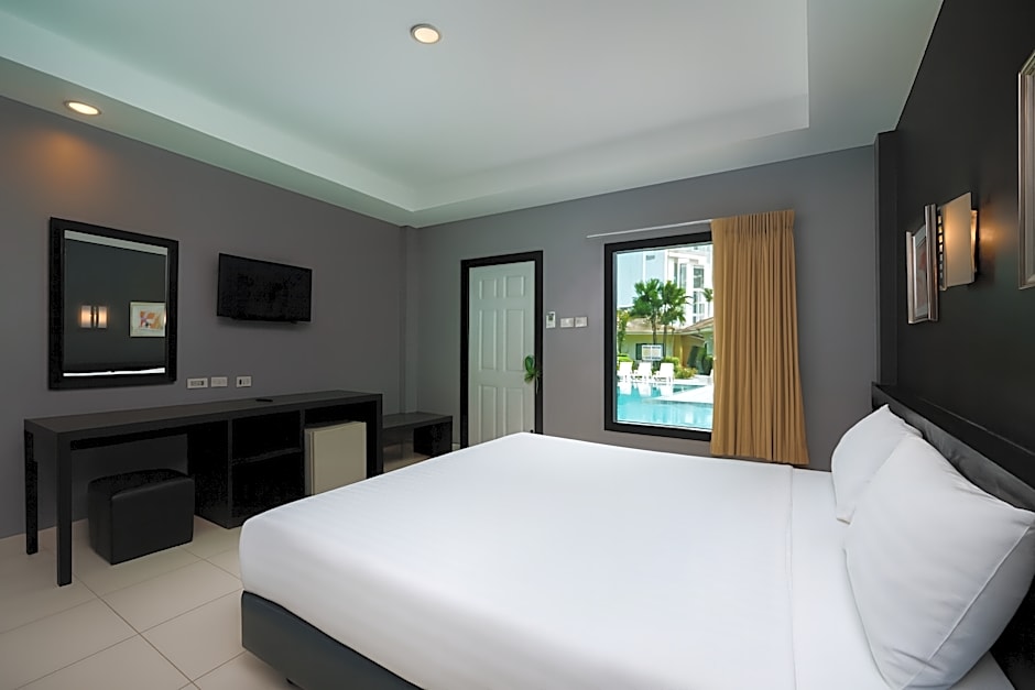Pool access bungalow offers air conditioning, a flat-screen TV and an outdoor seating area.